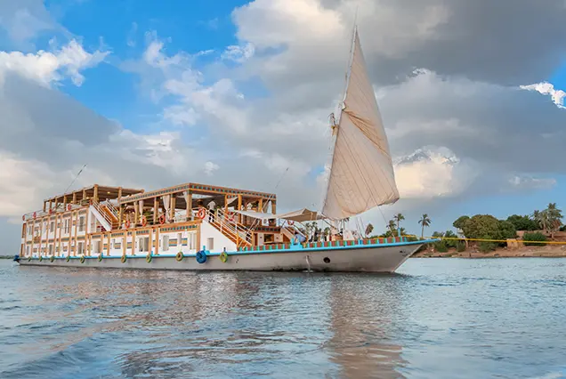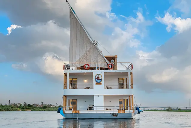 Einschiffung auf die Dahabiya und Beginn der Fahrt (ca. 4–5 Stunden) in Richtung El-Hegz-Insel.